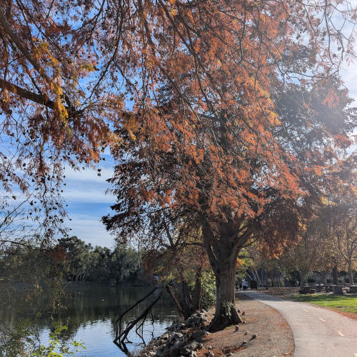 It did not disappoint! The walk around the lake was stunning. The path is flat and easy, but the mature trees along the shoreline and bordering Los Gatos Creek truly lit up with brilliant golds, reds, and oranges. It was the perfect change of pace, offering the color we desired without the intense elevation gain of the mountain parks. It’s an ideal spot for a post-hike cooldown or a simple, scenic nature walk.