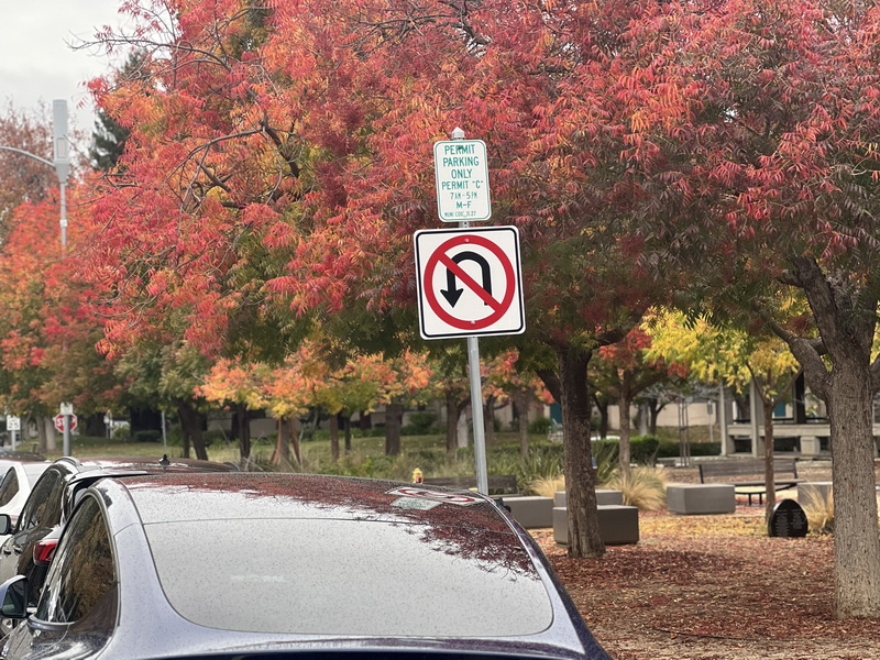 The illegal U-turns are typically made by southbound drivers turning around to enter the book dropbox area on the east side of the intersection, despite the four No U-Turn signs plainly visible. When drivers stop in the crosswalk area, it’s usually because they are parked and waiting at the brick pavement “bump-out” located along the west side of the intersection and bordered by black bollards. There are also four signs there stating No Parking attached to the bollards.