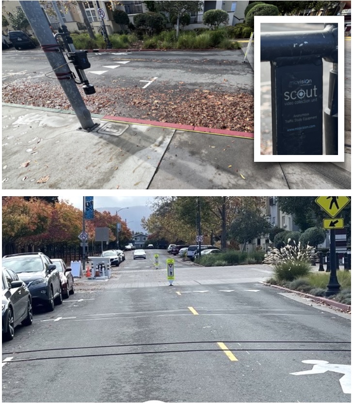 City Transportation staff have indicated that it has been 5 or 10 years since the city has collected data on this intersection and that it would be prudent to perform a new study. The staff have also provided the next steps for this study, including: (1) collect daily vehicle, bike, and pedestrian counts via video collection units, (2) collecting speed data (via pneumatic tubes and radar gun for spot checking), (3) overall review of existing conditions to see if there are any deficiencies or safety concerns, and (4) collision analysis to see if there have been any collisions at this location with particular focus on pedestrian-related collisions. Pneumatic tube collection units–the small black tubes you drive over that count vehicles–and two video collection units at the intersection were found at the intersection on November 14.