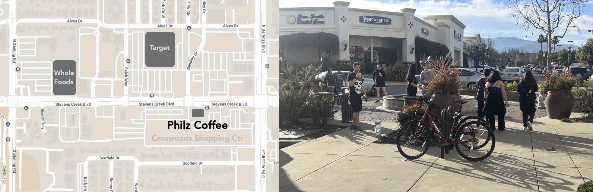 Today, let’s go to Philz Coffee! The coffee shop is located along Stevens Creek Boulevard, but is not very visible from the outside. You have to enter the shopping mall “The Crossroads” to be able to see it. Watch this video to see my visit to this friendly and biking-convenient shop.