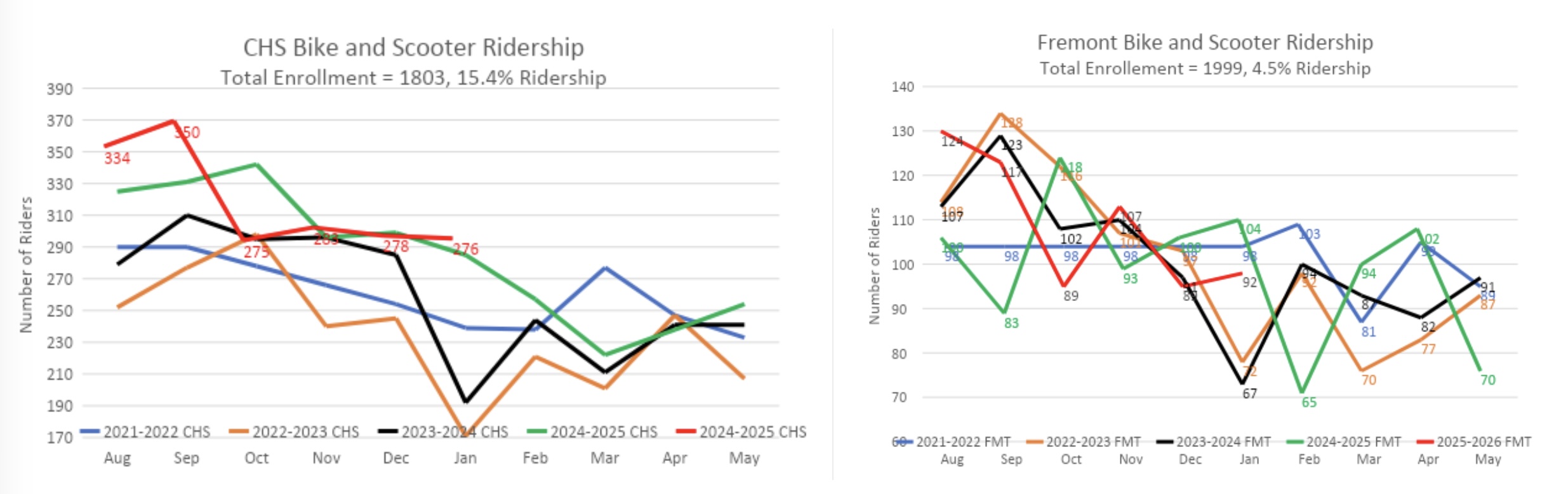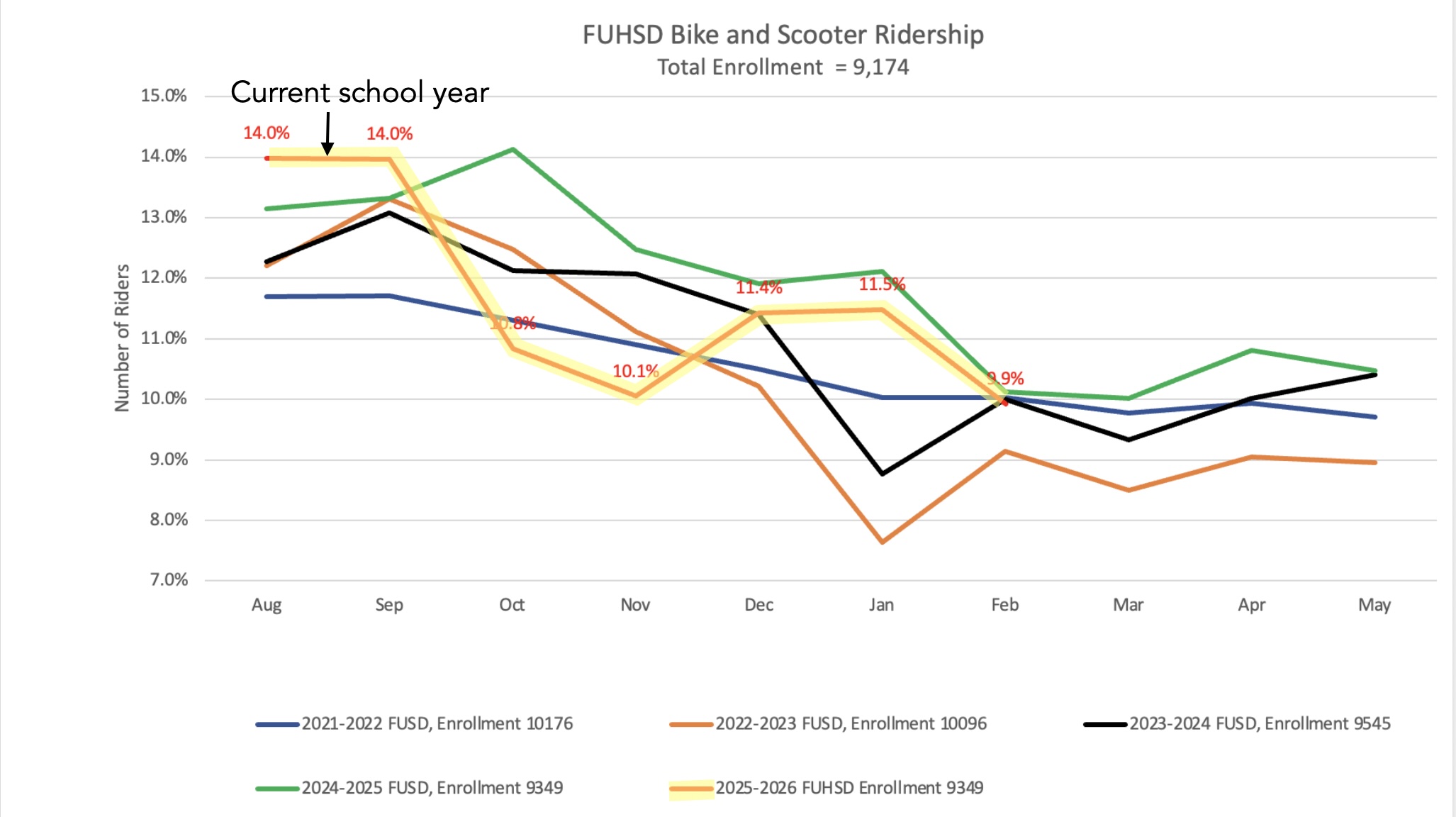 During this school year, the FUHSD High Schools saw a record-breaking 1283 bikers/scooters (14% ridership rate), the highest we’ve seen since the bike counts started.