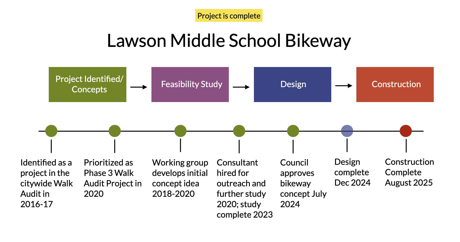 Current Status (September 2025): The bikeway was approved by City Council on July 9, 2024. Design was complete by the end of 2024. The bikeway was completed in August 2025 and is in use by students and community members.