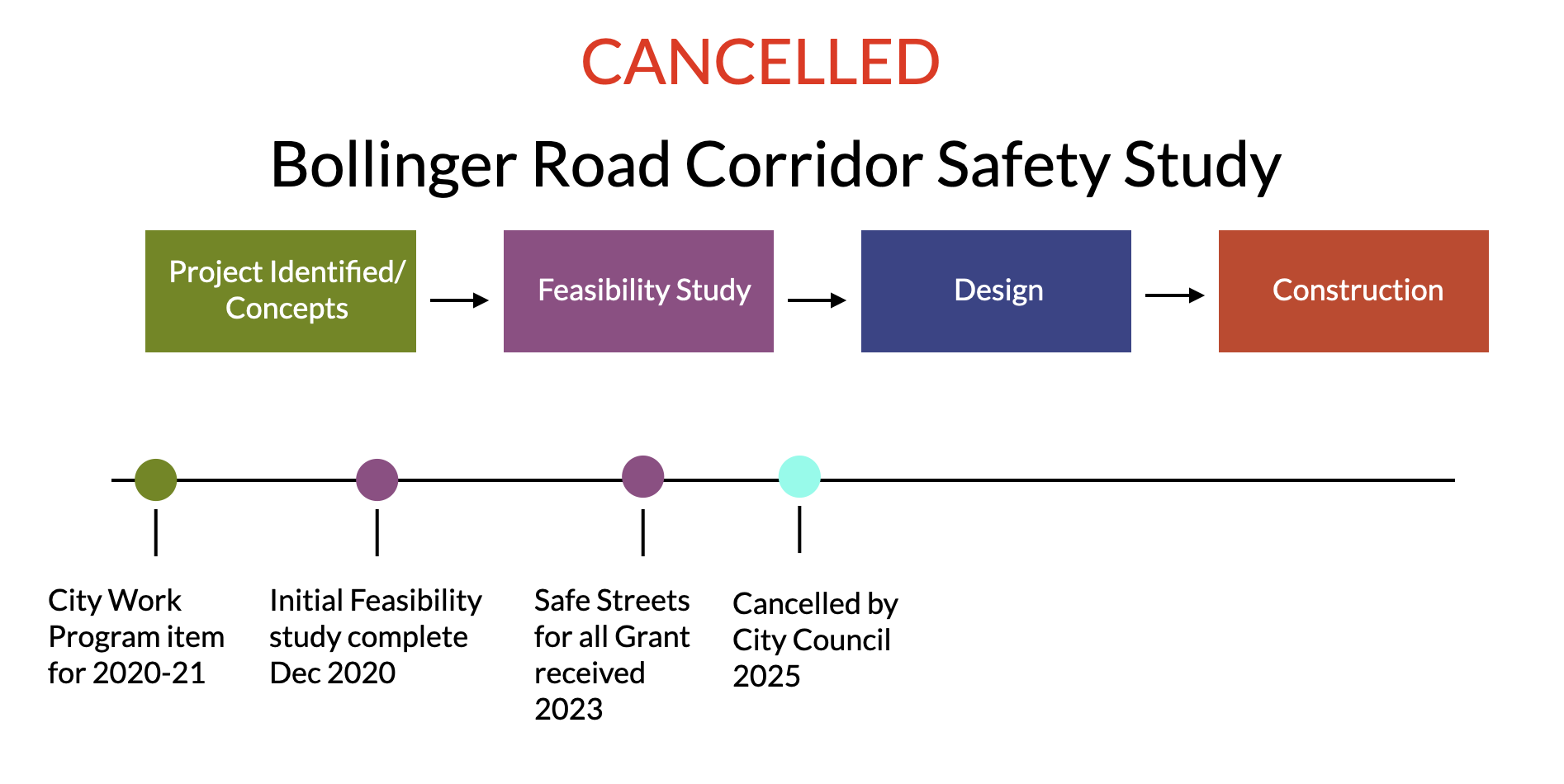 The study was cancelled by the newly installed City Council after six months of their tenure in June 2024, based upon fears that car traffic would be slowed if any changes were made to improve the safety along the corridor. The grant to cover 80% of the cost of the study was rejected and returned to the federal government.